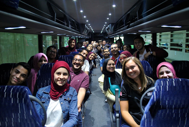 The first bus of students from Egypt, Palestine, Jordan, Tunisia, and Algeria leaving the Indianapolis airport.