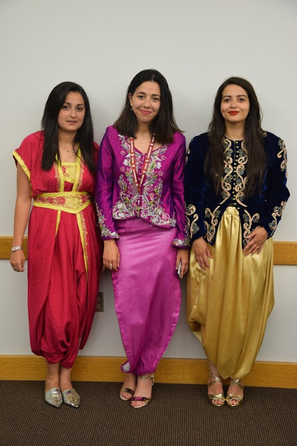 | Lilia Seba wearing serwal mdewer, Ahlam Aissaoui wearing karakou sweral chela, and Selma Benameur wearing karakou serwal mdewer – all traditional Algerian garments. |