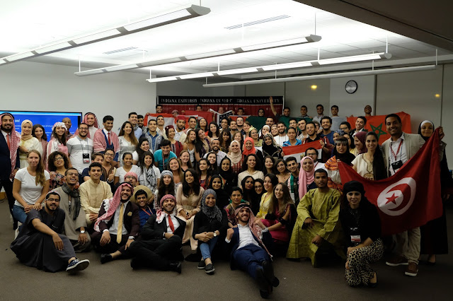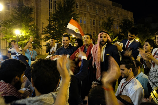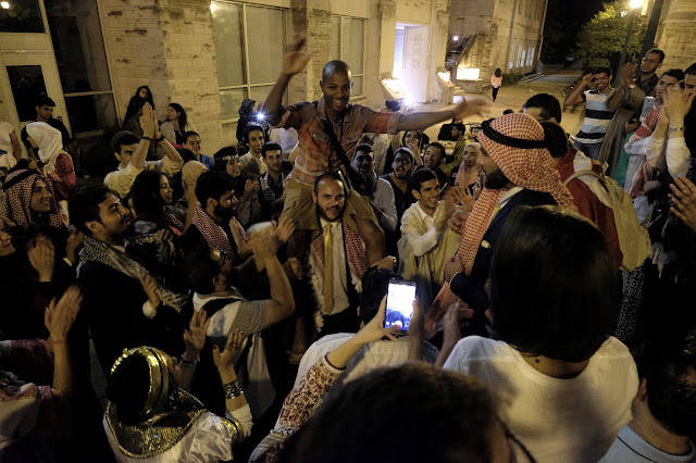 One of the most astonishing aspects of Culture Night occurred, however, after the technical “end” of the event. Once students were ushered out of the room in The Kelley School of Business, a spontaneous drum circle broke out in the courtyard. To the rhythm of a single tableh drum, the GBI students burst into song and dance. While regional accents sometimes make it hard to communicate when speaking, all the student were able to sing loudly and proudly in Arabic. The Kelley courtyard became a flurry of beating hands and feet, as GBIers hoisted one another off the ground and celebrated their rich heritage of merrymaking. In the words of Egyptian participant Mahmoud Abdelwahd, it was, “all the aroma, fragrance, and magic of the East combined in one place and at one time.”